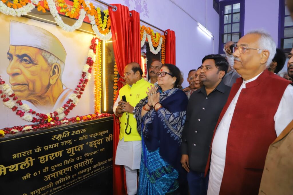 कानपुर, 12 दिसम्बर। राष्ट्रकवि स्व. मैथिलीशरण गुप्त की 61वीं पुण्यतिथि के अवसर पर कानपुर जर्नलिस्ट क्लब में आयोजित चित्रपट अनावरण एवं पुष्पांजलि कार्यक्रम में शहर के साहित्यप्रेमियों, राजनेताओं और पत्रकारों ने देश के इस युग प्रवर्तक कवि को भावभीनी श्रद्धांजलि अर्पित की। कार्यक्रम में महापौर प्रमिला पाण्डेय, विधायक नीलिमा कटियार, विधायक सुरेंद्र मैथानी सहित बड़ी संख्या में प्रबुद्धजन मौजूद रहे।
